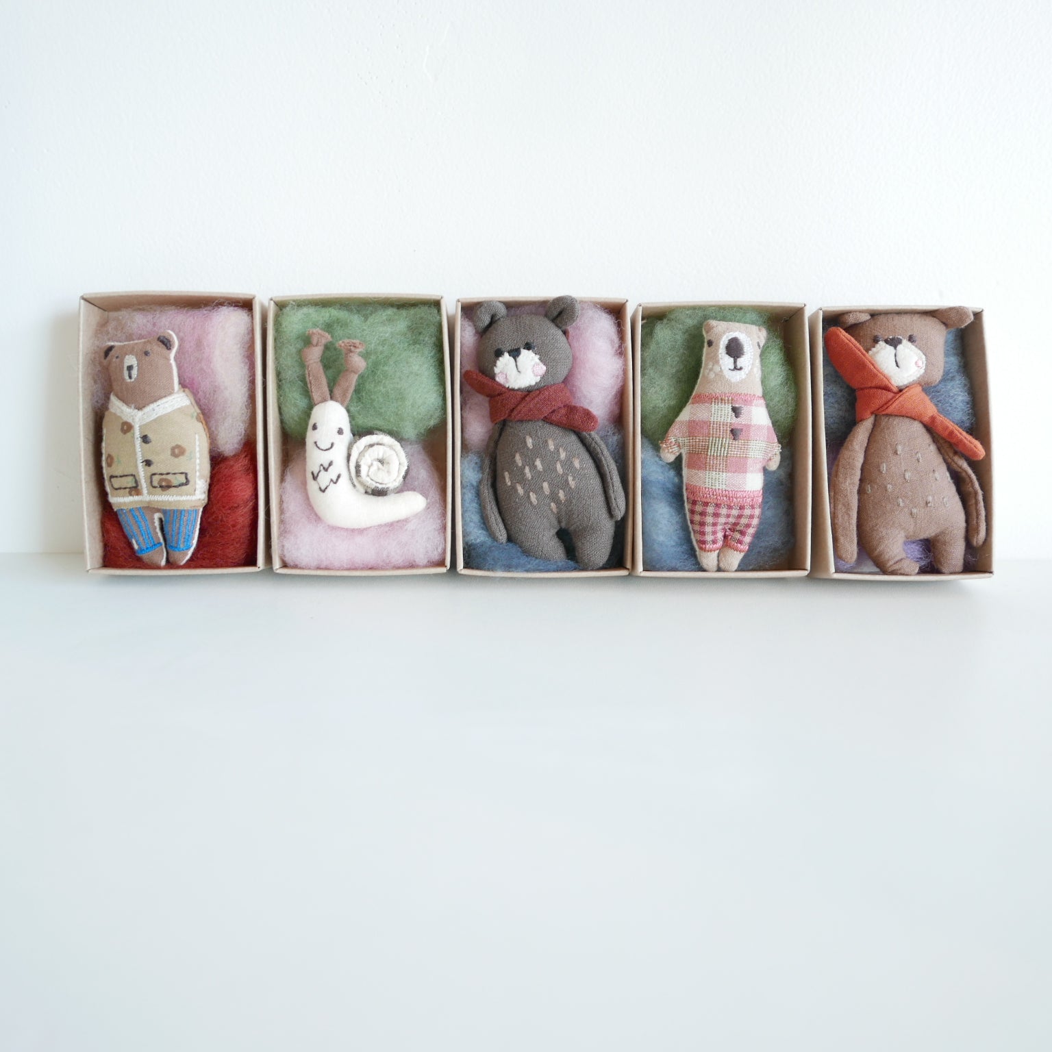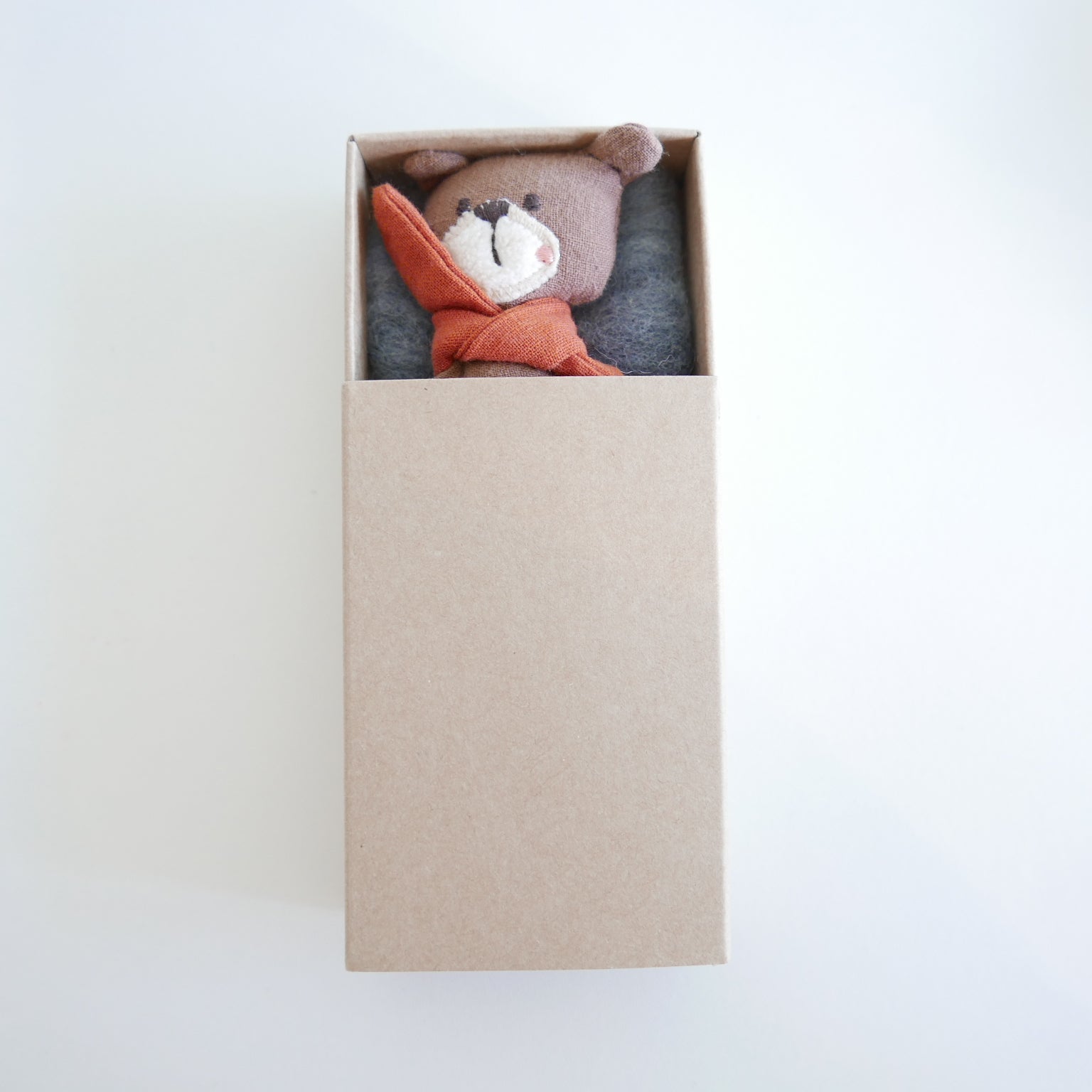 Fabric bear with embroidered details in a small matchbox with felt bedding.