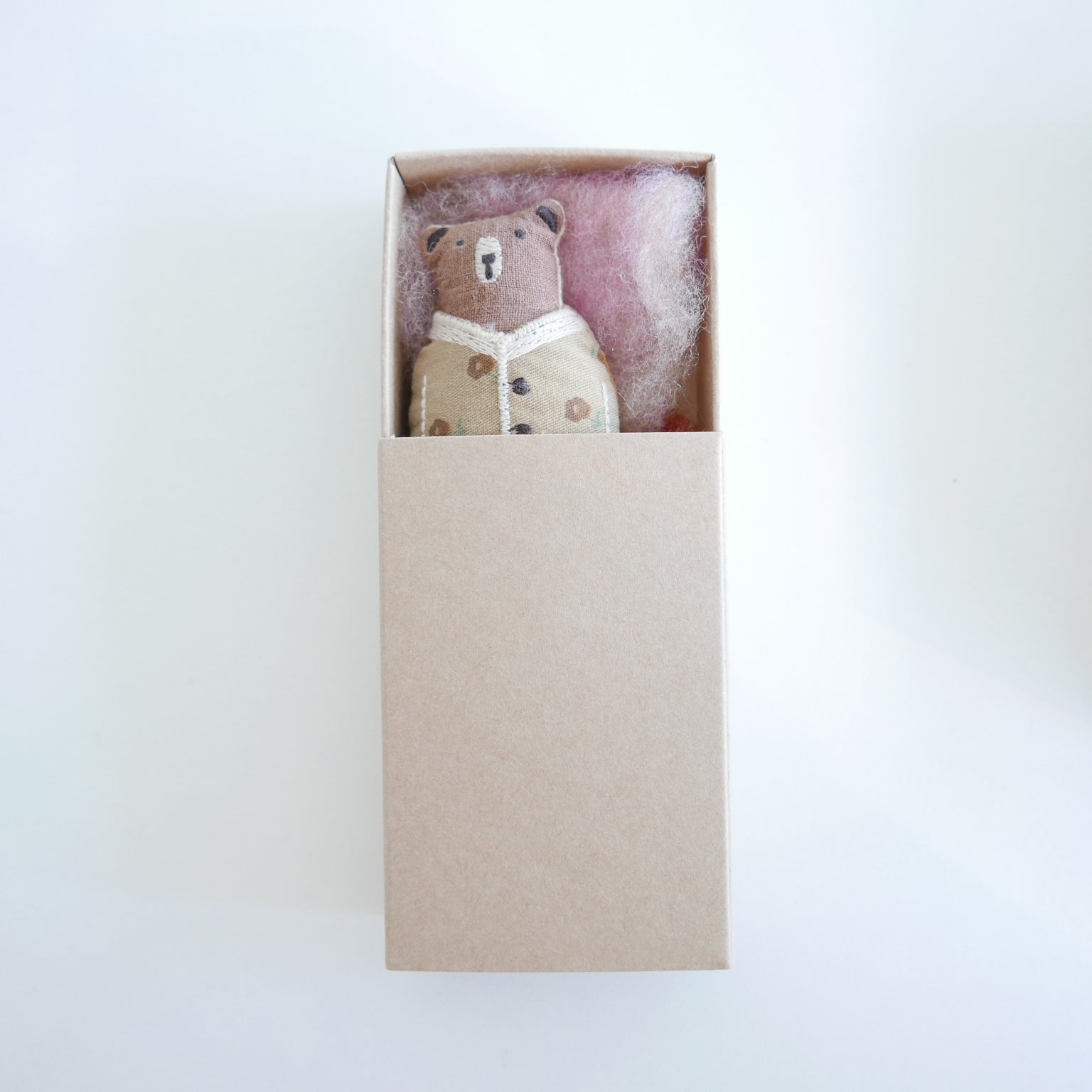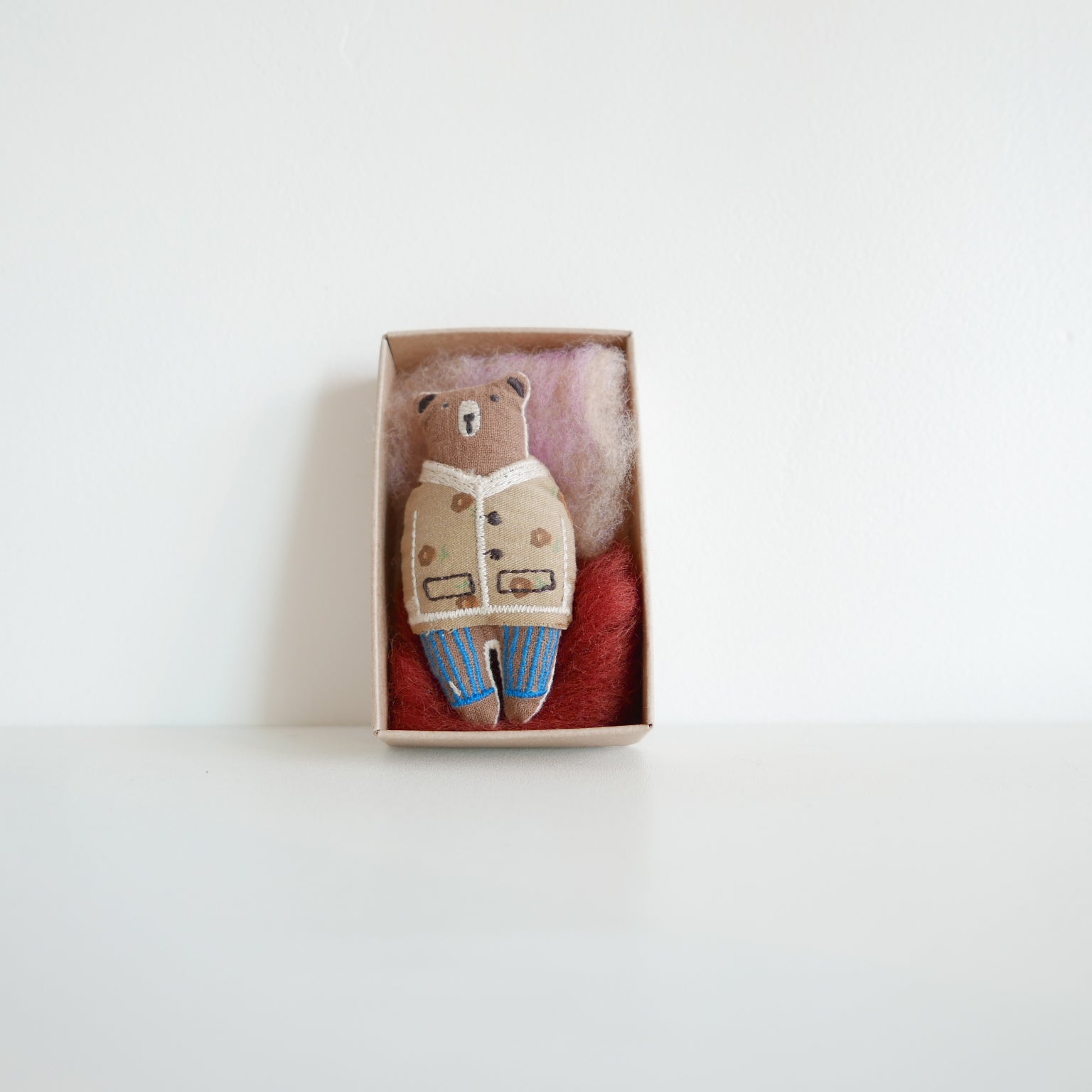 Fabric bear with embroidered details in a small matchbox with felt bedding.