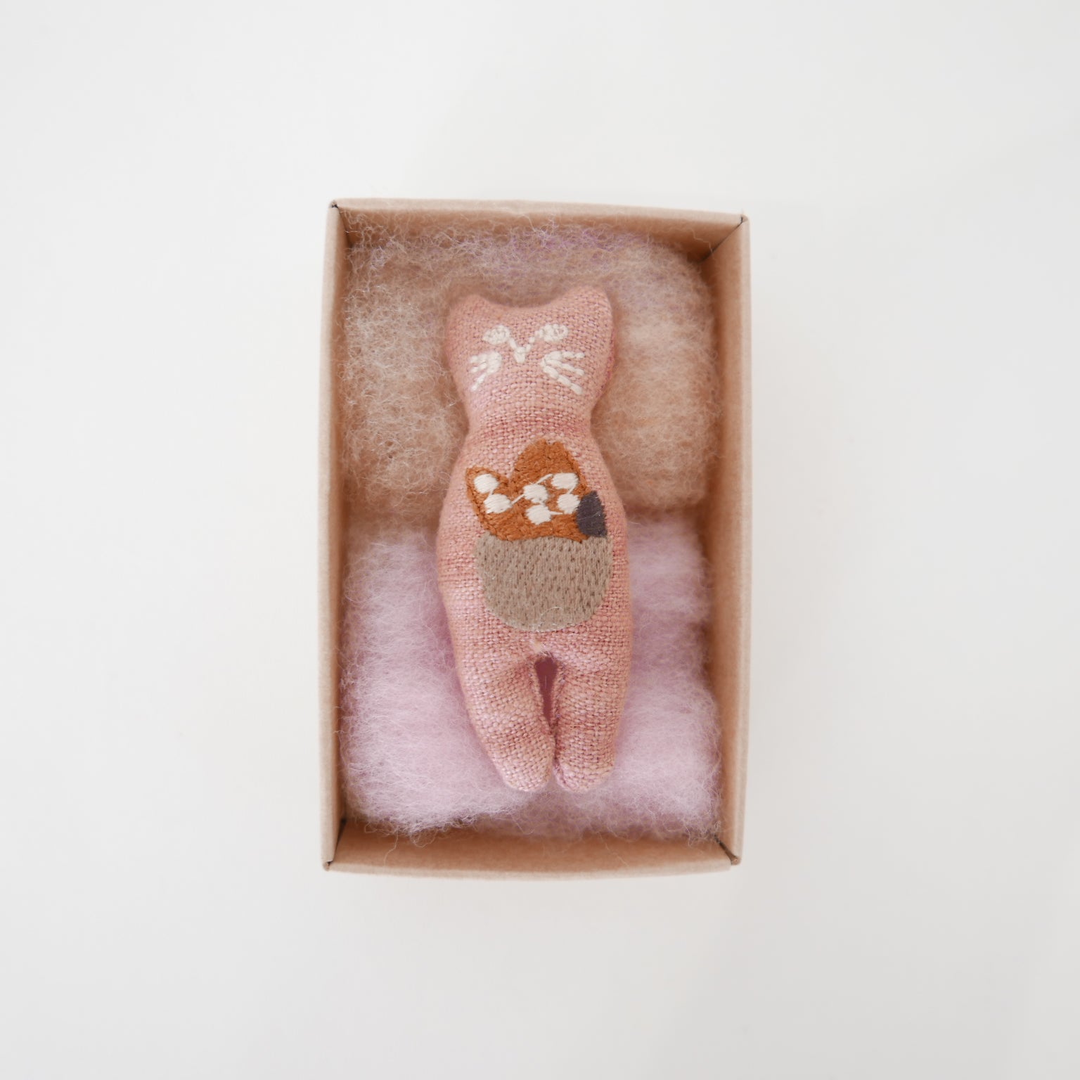 Fabric cat with embroidered details in a small matchbox with felt bedding.