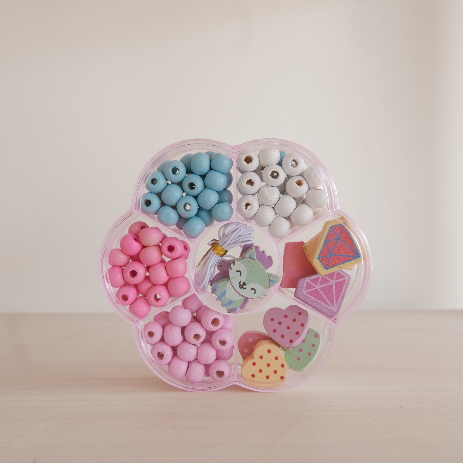 A very fun activity set - includes assorted wooden beads and elastic in a cute flower shaped container. You can make bracelets, necklaces, garlands and more.