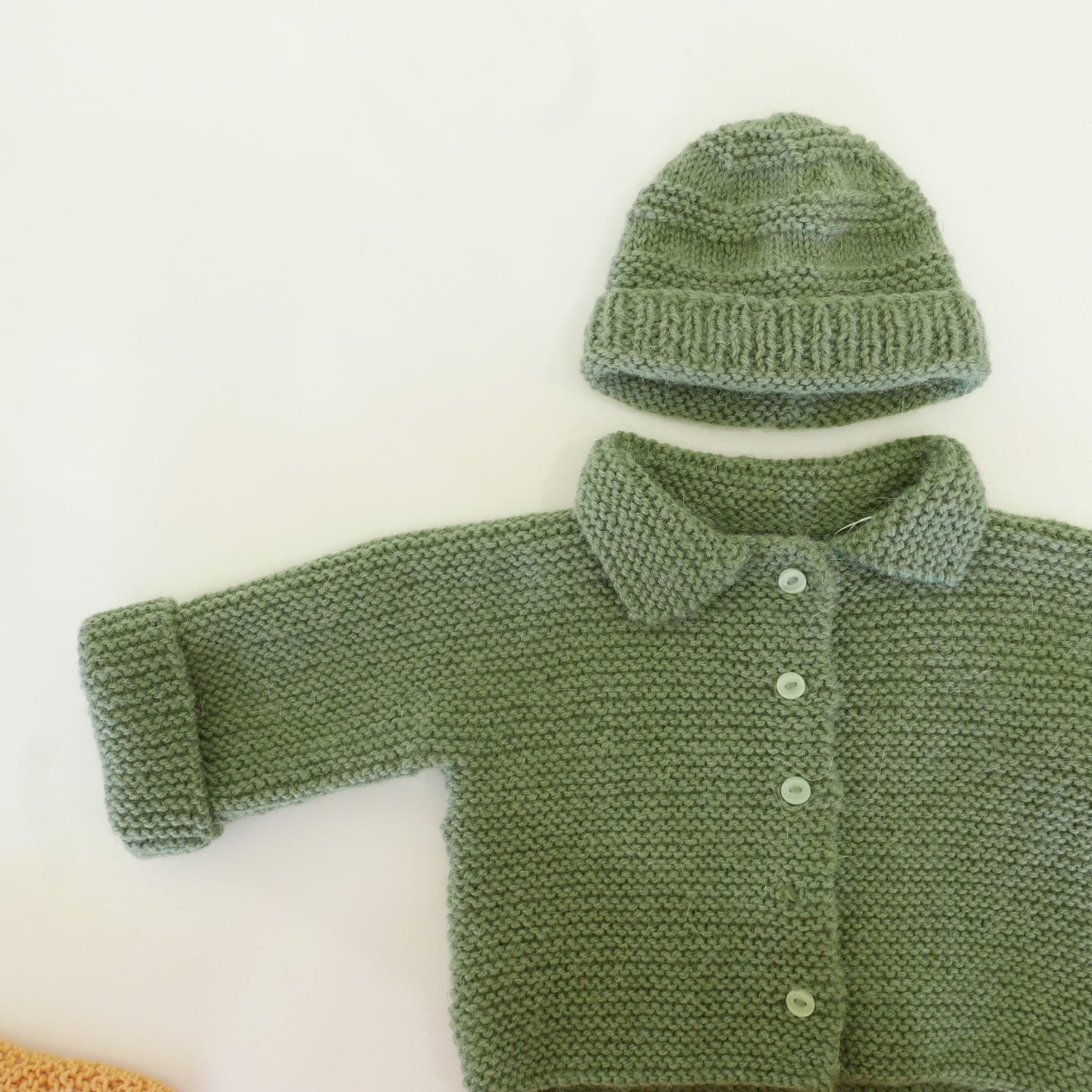 A gorgeous, hand knitted set including a button down cardigan and a cute beanie.