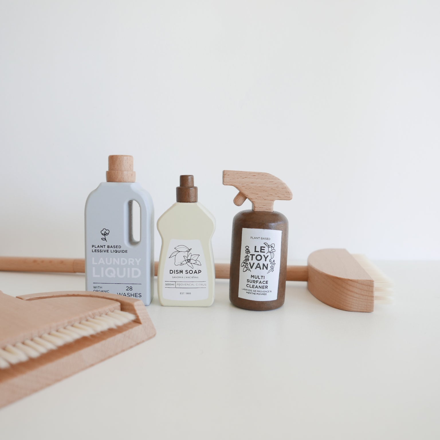 Perfect for the little helper, this set features a broom, cute brush and shovel and three wooden cleaning bottles.