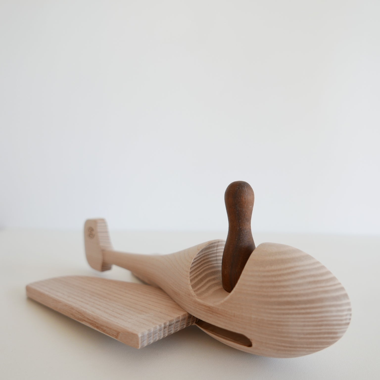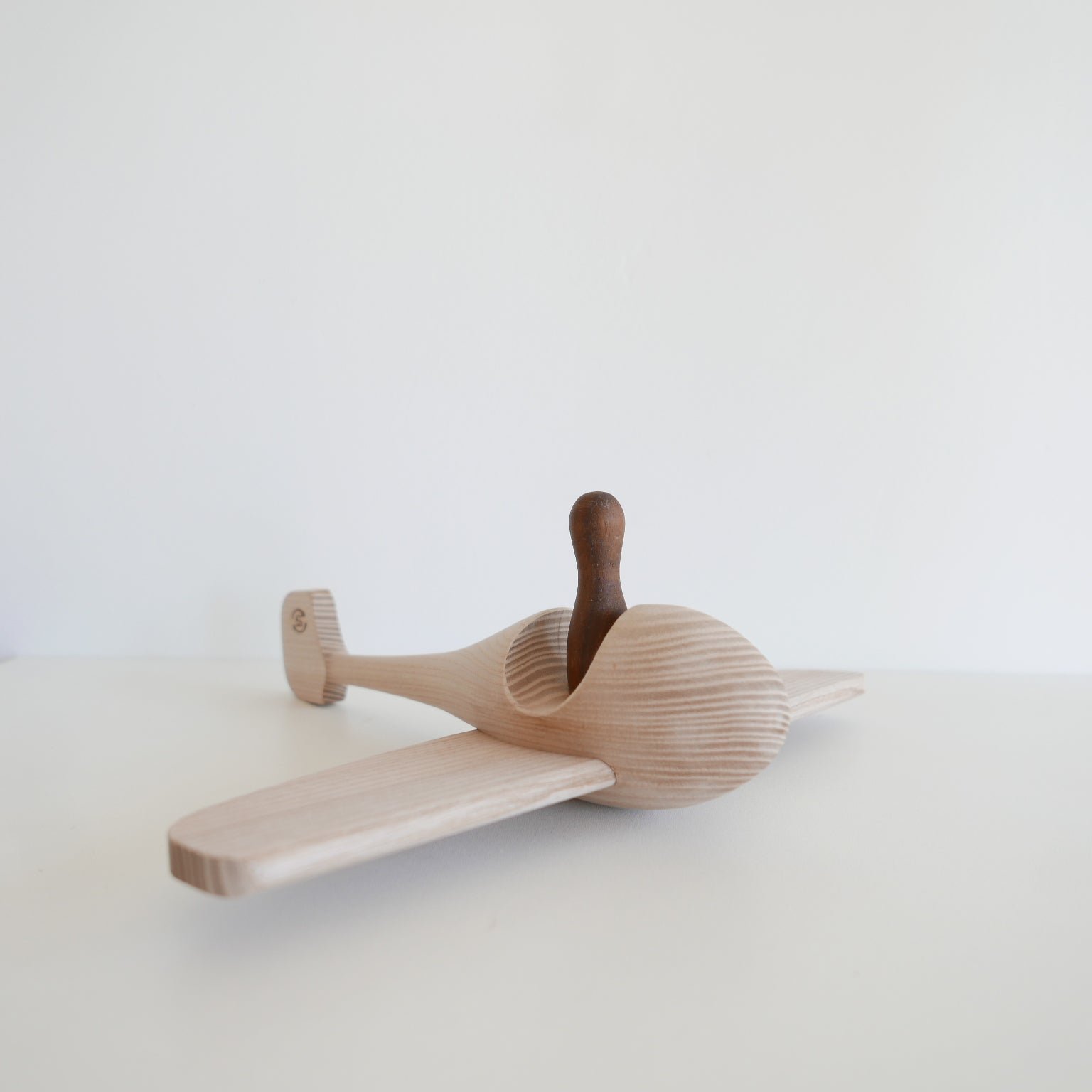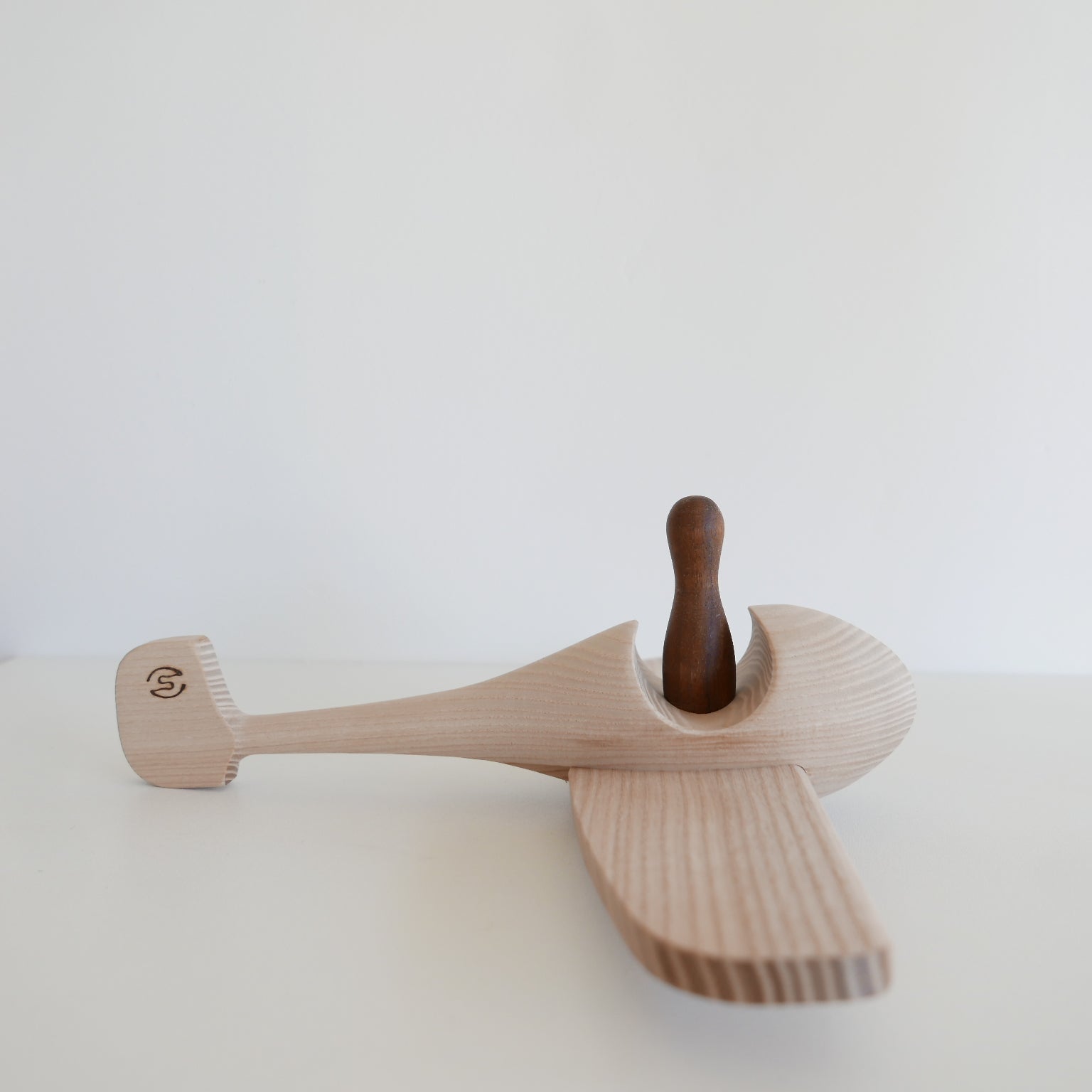 Softly sanded and ready for play, this aeroplane is so lovingly made. Featuring one dark wood figurine and aeroplane wings that fold down.